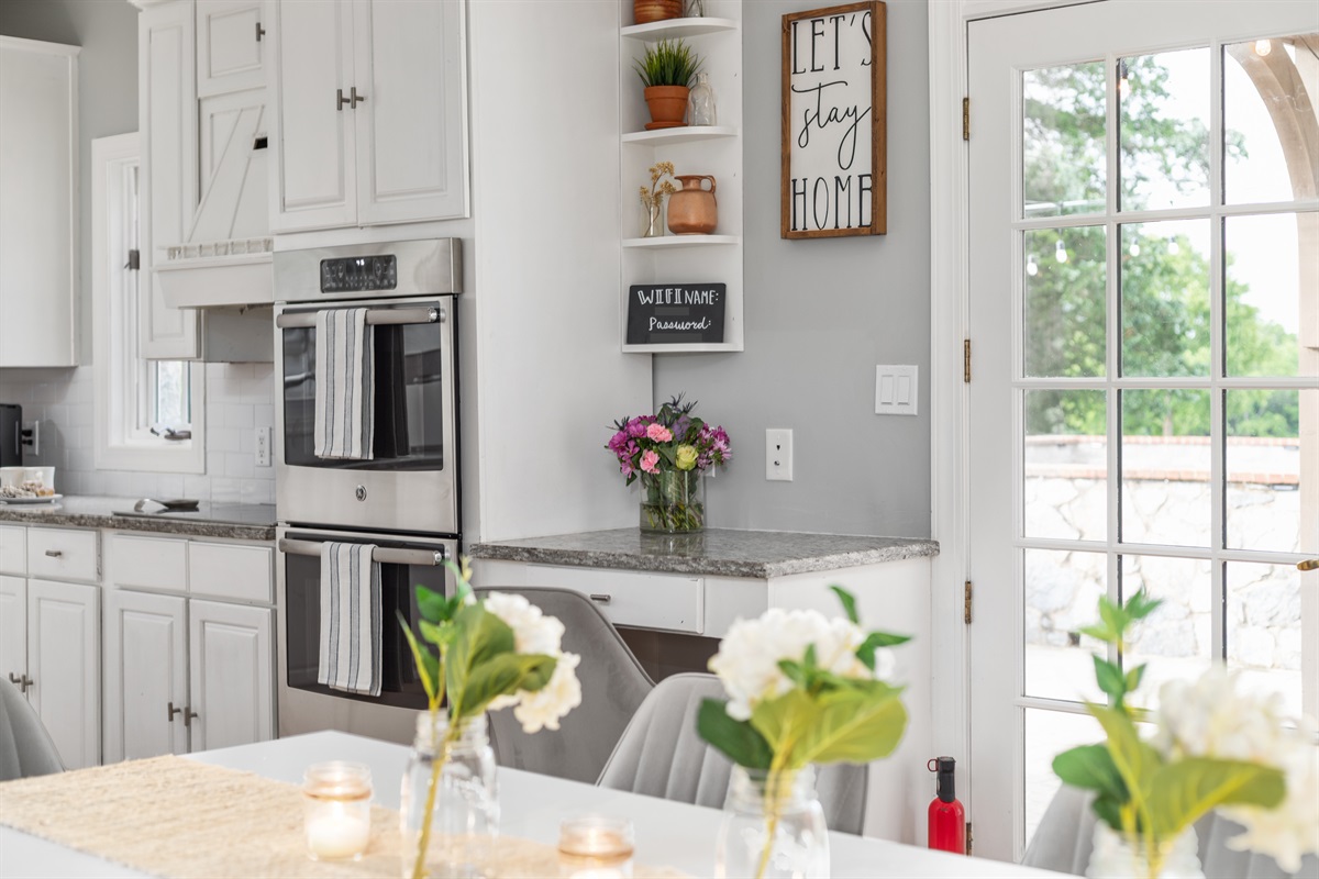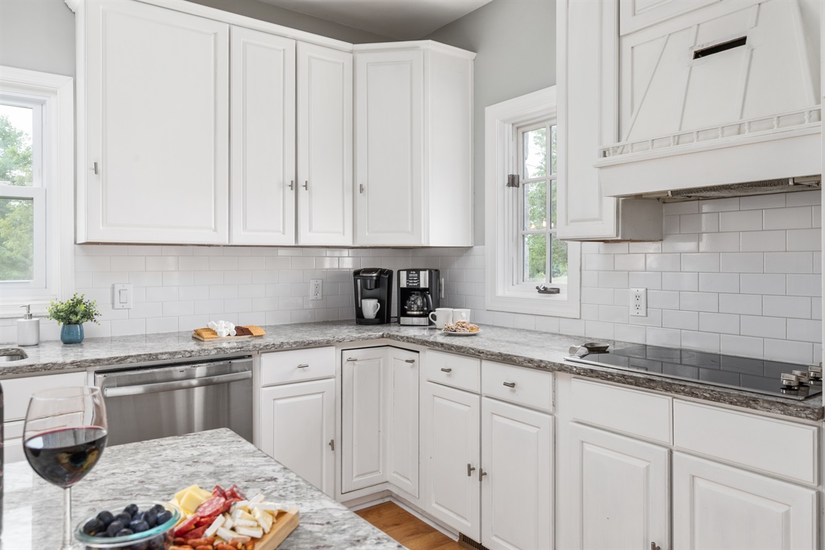 The bright and spacious chef’s kitchen is fully equipped to handle everything from morning coffee to group dinners: