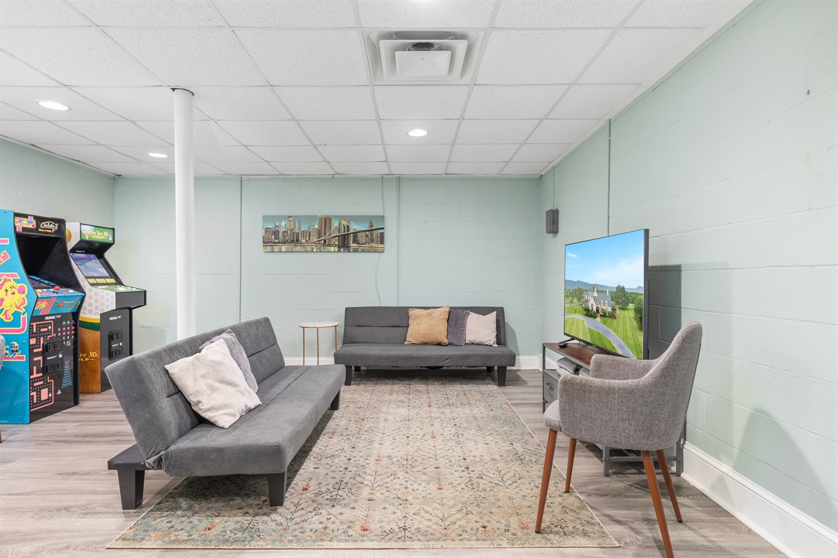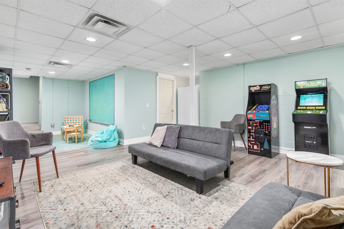 Bedrooms are spread across two levels, making the home ideal for families or groups seeking both space and comfort. A separate game room downstairs offers retro arcade machines like Ms. Pac-Man and Golden Tee, a smart TV, and ample seating. Near the kitchen, you’ll also find a curated collection of books and board games for all ages.