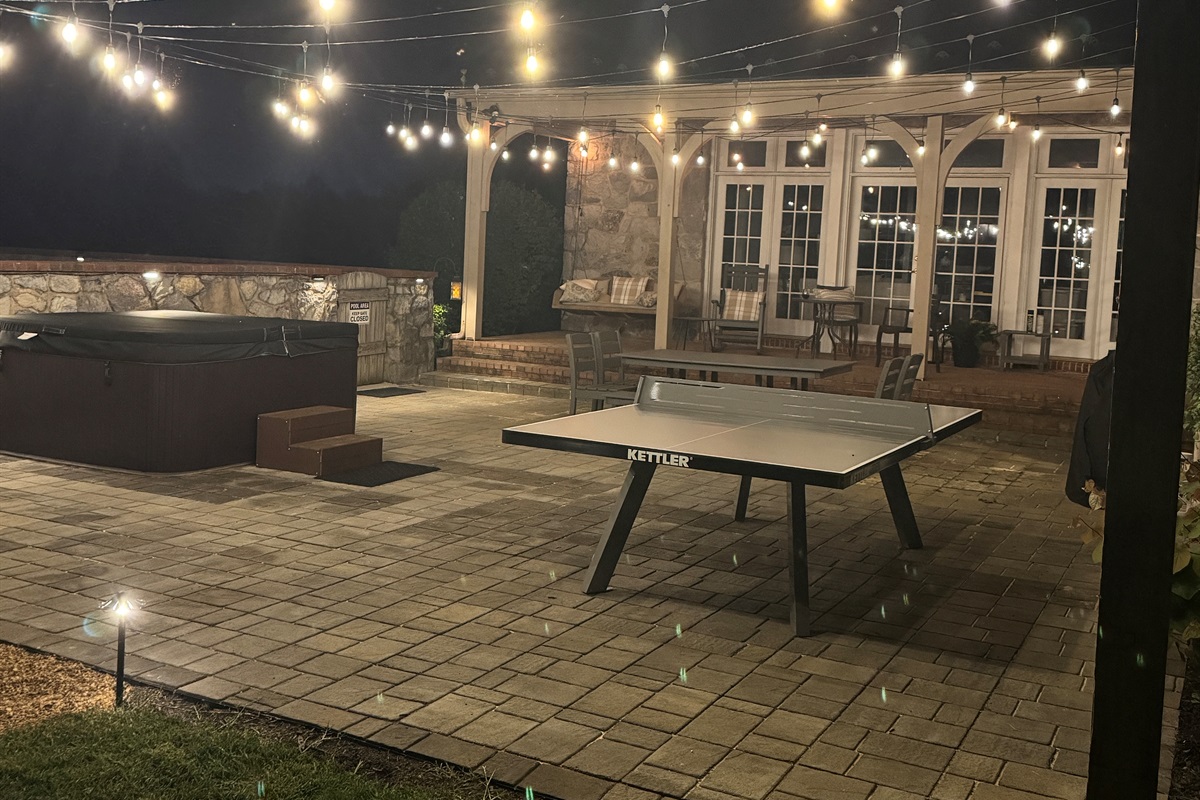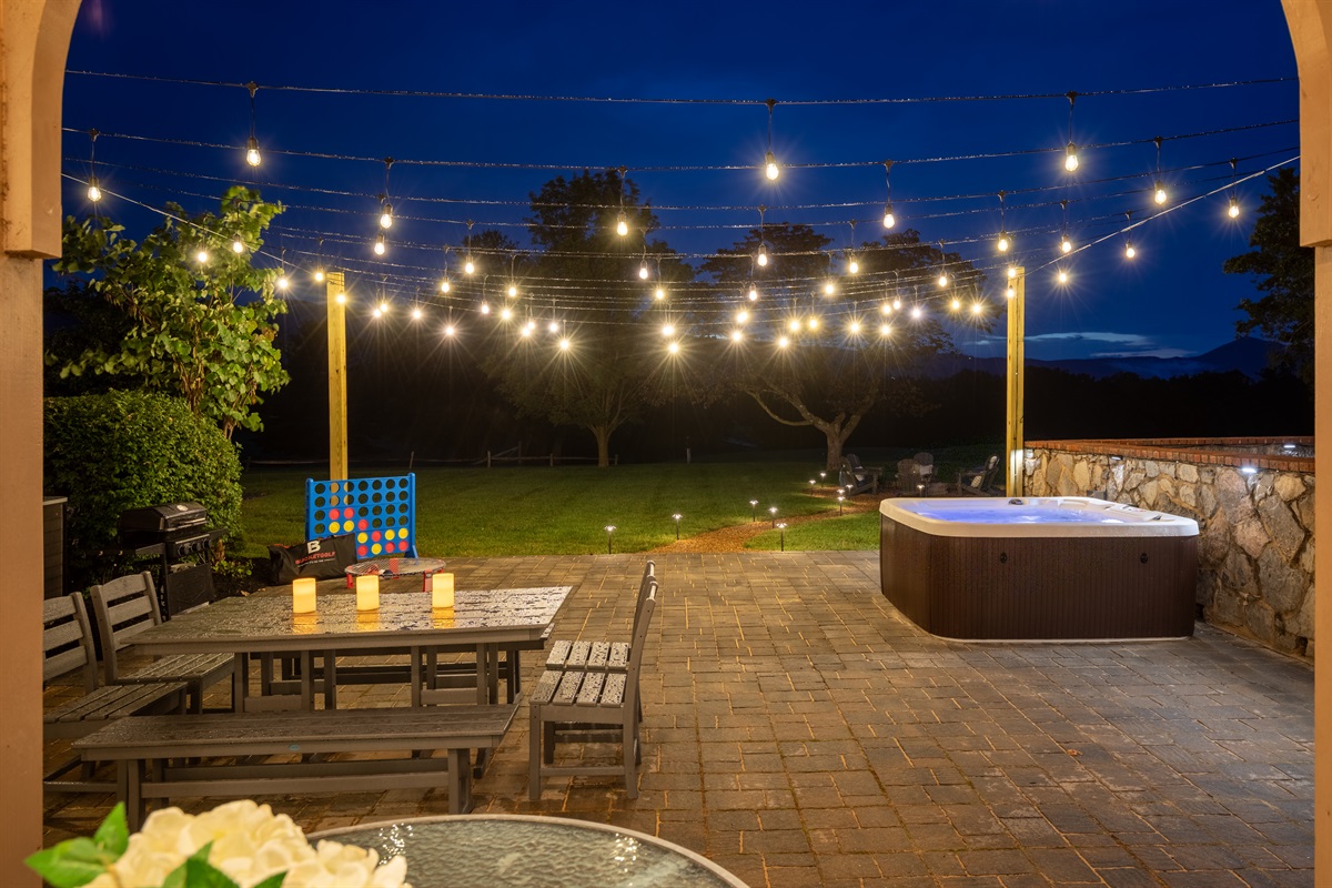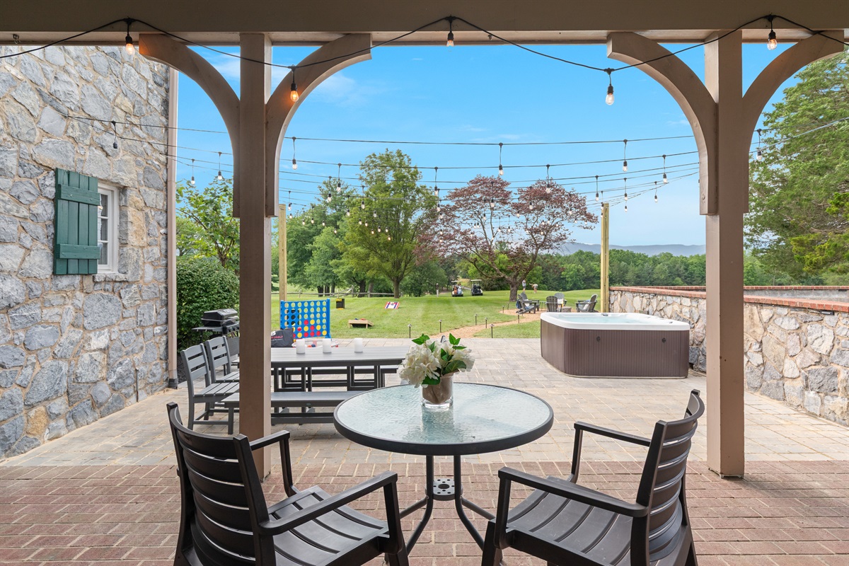 ✔ Outdoor Dining Area – Covered patio with string lights and tranquil views