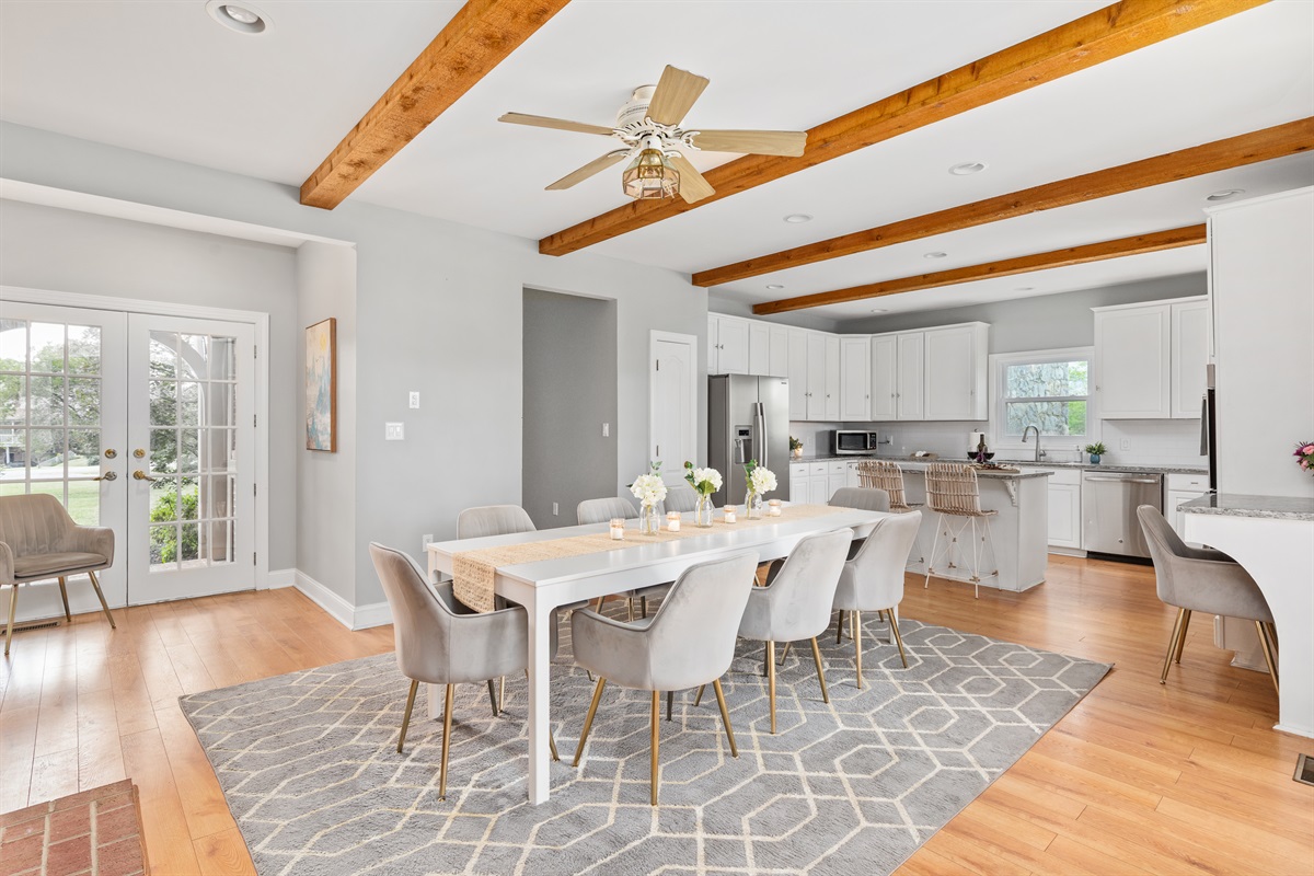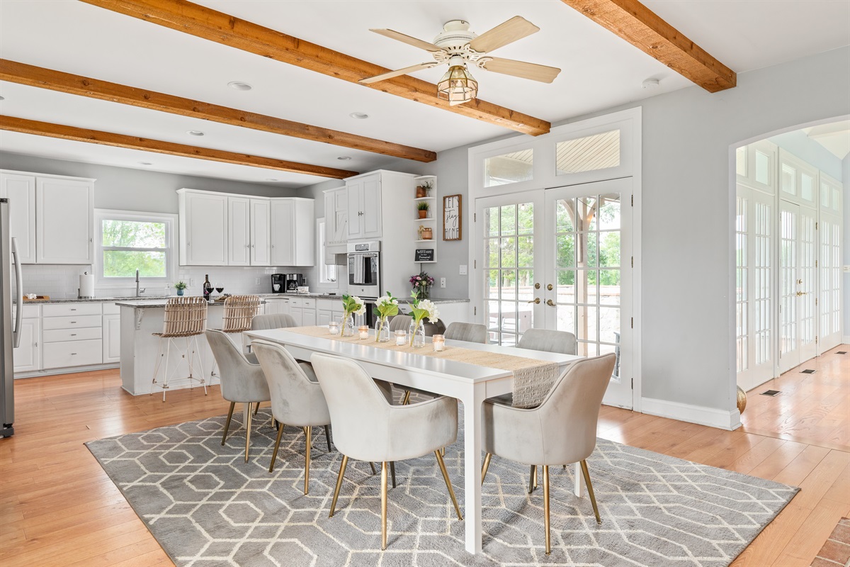 Gather around the dining table with seating for 8, located beside the stone fireplace - a cozy setting for shared meals, celebrations, or game nights. Additional chairs or barstools at the nearby island can be pulled up as needed to accommodate larger groups.